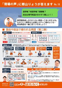 また、「現場の声」に郡山りょうが答えます!のコーナーでは、 ニュースで拝見するような国会でよく使われる用語の解説をしています!